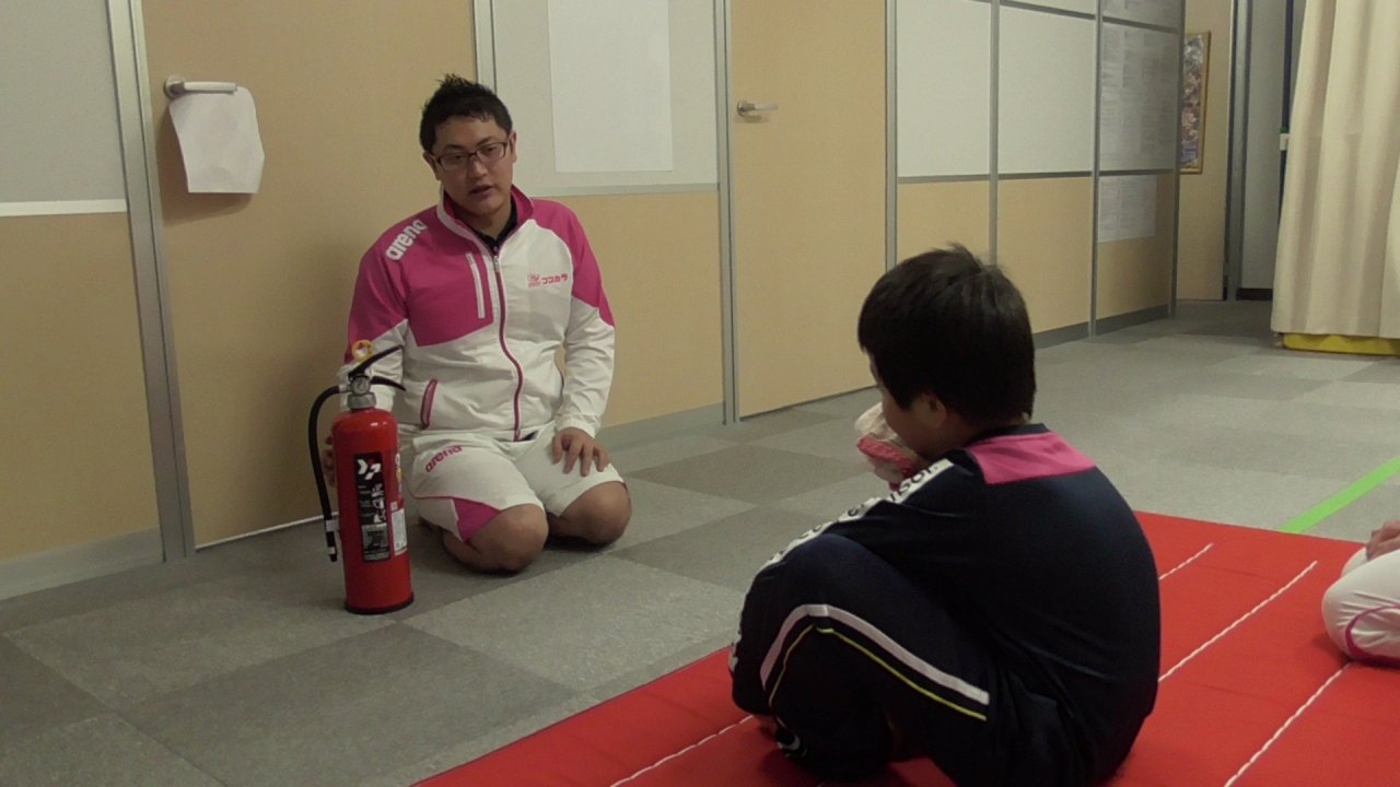 周囲への伝達やお子さまの安全確認をした後、一時避難場所の「四堀合公園」に行きました。戻ってきたら、消火器の使用方法や3種類の円形マークについて説明し、そして再度、落ち着いて行動していく大切さを伝えました。