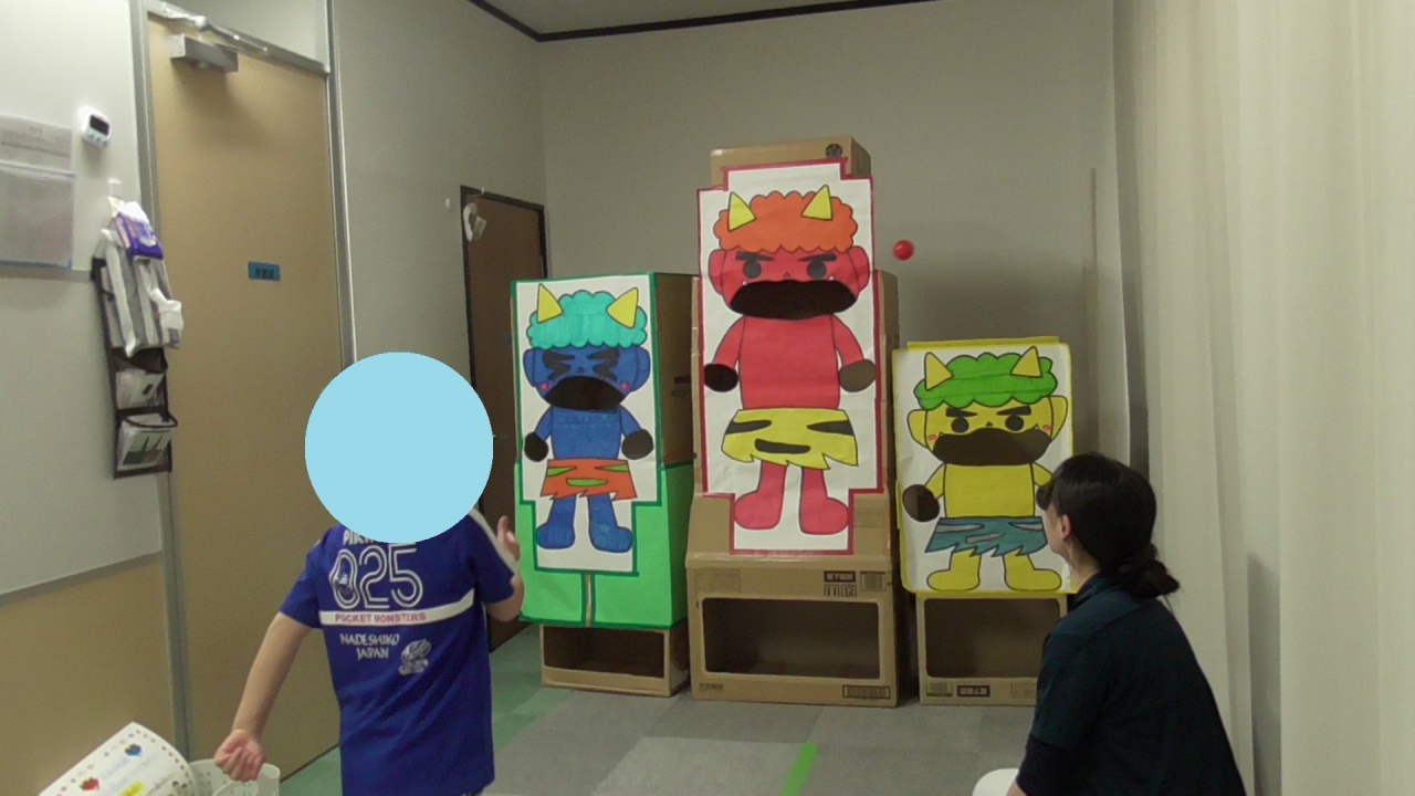 2つ以上の指示理解(情報整理)、目と手の協調、力の調整・操作を意識しながら・・・節分の風習を理解する目的として行いました。